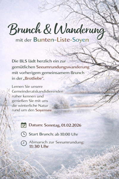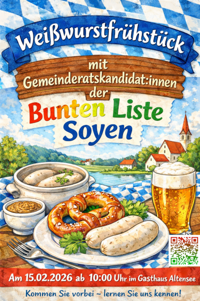 Wahlziele der Bunten-Liste-Soyen sind unter anderem: Soyen zukunftsfähig so mitzugestalten, dass es für alle Bürgerinnen und Bürger von heute auch morgen noch ein Zuhause sein kann, das nachhaltig und lebenswert ist.